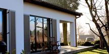 Der Bungalow aus den Sechziger Jahren wurde umgebaut und modernisiert. Das Haus wurde mit schwarzen, bodentiefen Holz-/ Aluminiumfenstern ausgestattet. Die klassischen Fensterläden verleihen dem Bungalow einen besonderen Charakter. Das Haus bekam ein völlig neues Erscheinungsbild, das dennoch seine Wurzeln nicht leugnet.