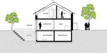 - Haustechnik : Erdflächenkollektor mit Sole-/Wasser-Wärmepumpe. Zentrale Lüftungsanlage mit Wärmerückgewinnung. Regenwasserzisterne zur Gartenbewässerung und Nutzung im Objekt (WC-Spülungen).